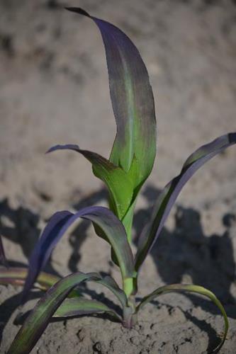 Fosforgebrek bij maïs (bron: YARA, Phosphorus Deficiency Corn)