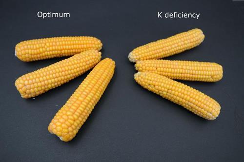 Kaliumgebrek uit zich in de eerste plaats door het geel worden en verdorren van de bladranden. De symptomen verschijnen doorgaans pas 4 tot 6 weken na planten. Als het gebrek aanhoudt, verdorren de bladeren verder naar het midden. Kalium is zeer mobiel in de plant. Bij een gebrek wordt kalium van de oudste naar de jongste bladeren getransporteerd. De gebreksverschijnselen verschijnen dus eerst op de oude, onderste bladeren. Een kaliumgebrek maakt planten gevoeliger voor extremen (te droog / nat / warm / koud), ziekten en plagen. Planten met kaliumgebrek groeien trager en hebben een onderontwikkeld wortelstelsel. Een verminderde stevigheid van de stengel kan tot meer legering leiden. Kolven zijn smal en spits en de top is onvolledig gevuld. Een kaliumgebrek wordt in de hand gewerkt door omstandigheden die de jeugdige wortelgroei, -ontwikkeling en -activiteit remmen.